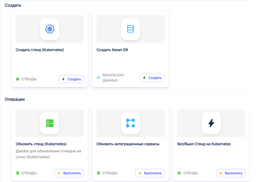 - Создание или обновление стенда. Новый стенд разворачивается всего лишь за 10-15 минут— причем уже с нужными версиями компонентов.